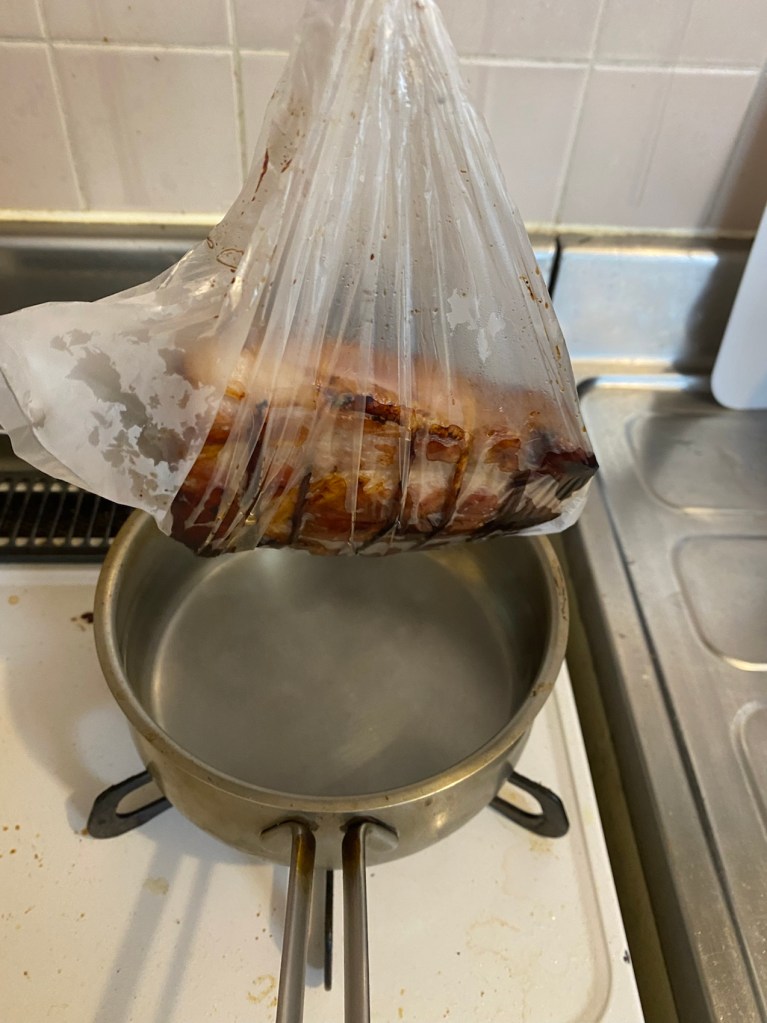 全面に焼き目がついたら、袋に入れて密封します。一度沸騰させたお湯に投入。